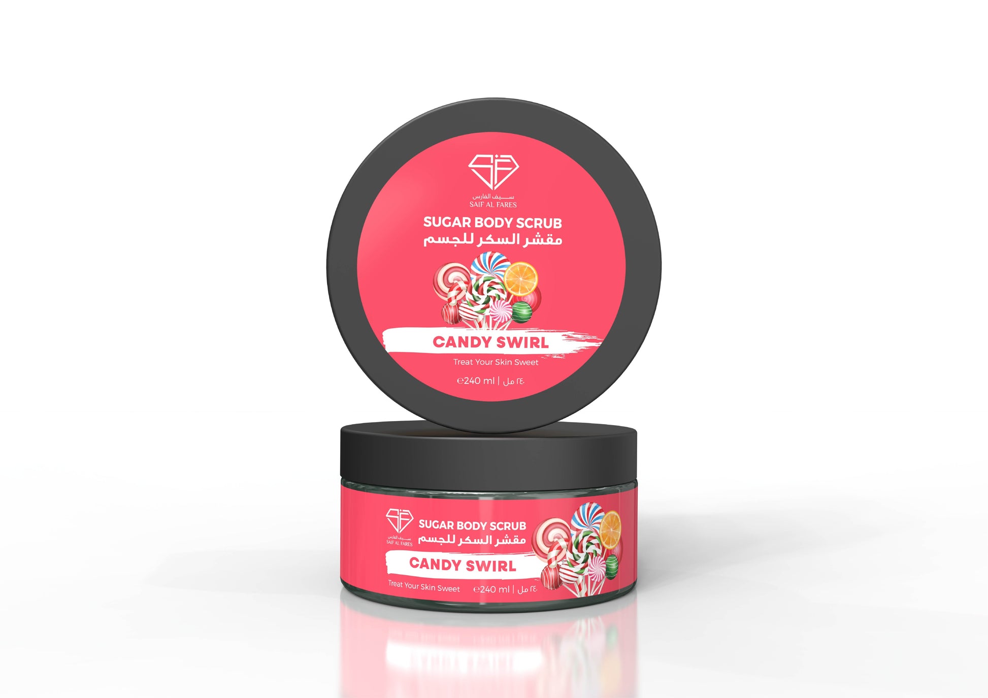 Revitalize your skincare routine with the SUGAR BODY SCRUB CANDY SWIRL 240ml an invigorating exfoliant crafted to brighten and refresh your skin.